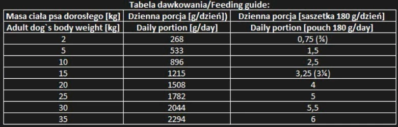 - W tabeli dawkowania przedstawiono początkowe porcje, które pokrywają dzienne zapotrzebowanie psów dorosłych na substancje odżywcze.