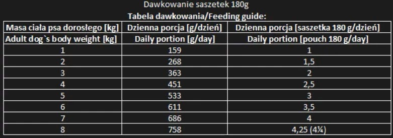 - W tabeli dawkowania przedstawiono początkowe porcje, które pokrywają dzienne zapotrzebowanie psów dorosłych na substancje odżywcze.
