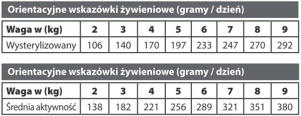 - Ilość stosowanej karmy zależy od poziomu aktywności, rasy oraz warunków środowiskowych.