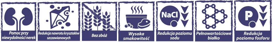 - Dla kotów wymagających diety opartej na przyjmowaniu ograniczonej ilości białka oraz fosforu.