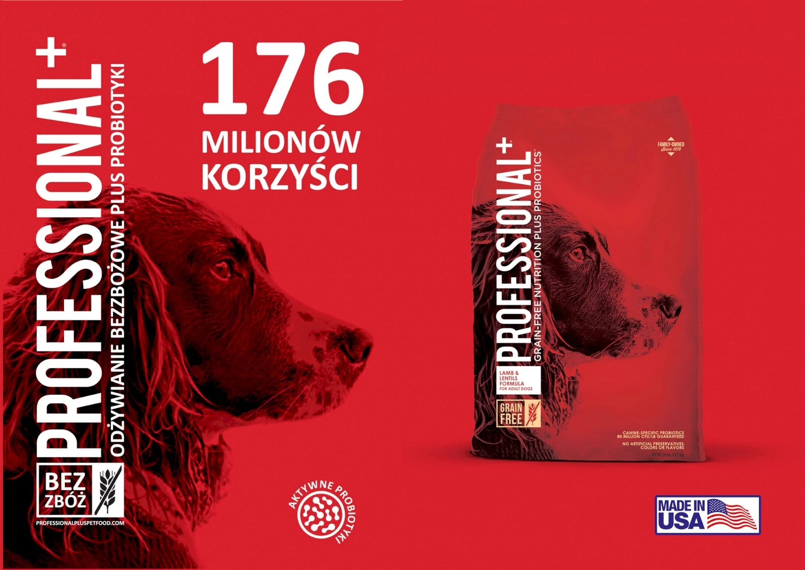 - Professional+ zawiera opatentowane probiotyki wieloszczepowe K9 Strain dla psów, które zawierają 5 różnych szczepów bakterii.