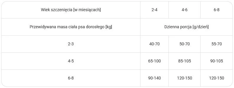 - Kompletna karma bezzbożowa dla szczeniąt (do 8. miesiąca życia) małych ras (poniżej 8kg wagi).