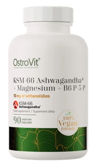 - OstroVit KSM-66 Ashwagandha® + Magnez + B6 P-5-P VEGE to wegański suplement diety, który łączy naturalne właściwości adaptogenne ashwagandhy z magnezem i wysoko przyswajalną witaminą B6.