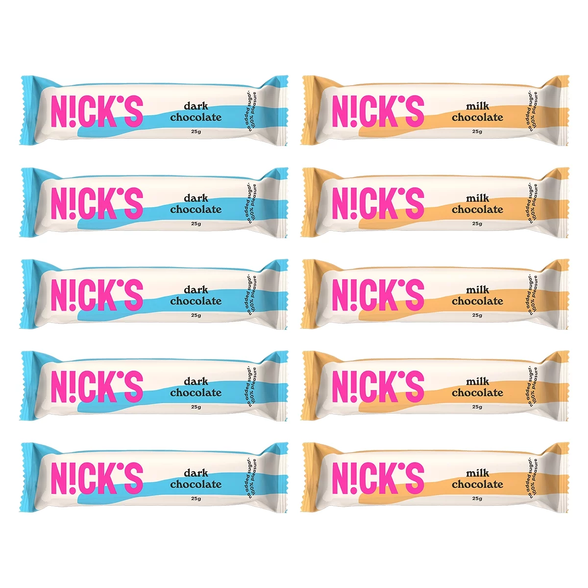 Zestaw mix smaków batonów N!CK'S: 5szt. Milk Chocolate bez cukru 25g, 5szt. Dark Chocolate bez cukru 25g