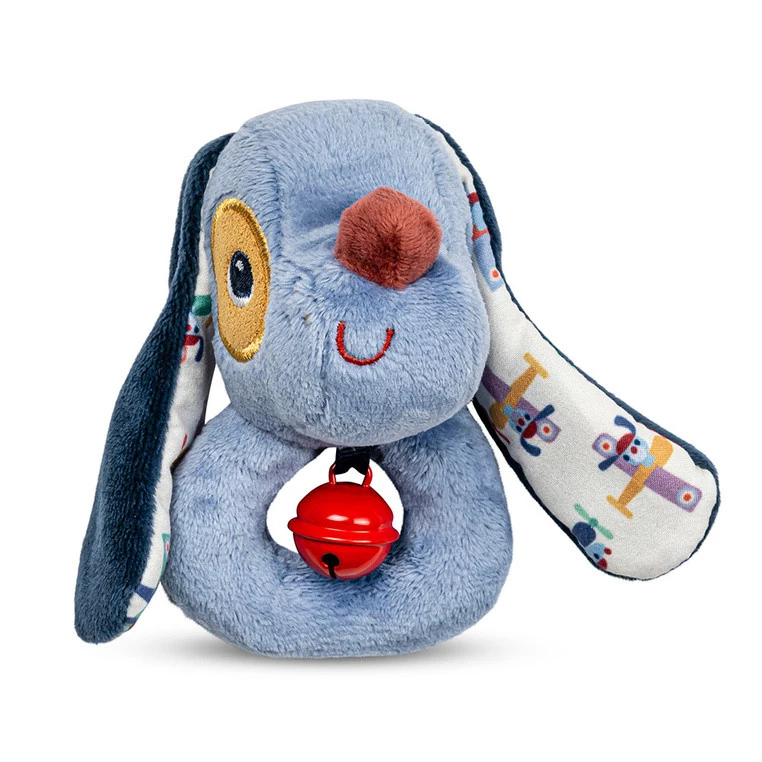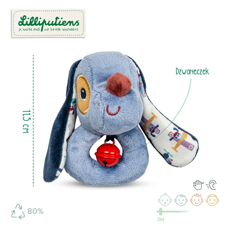 Grzechotka z dzwoneczkiem Piesek Jules belgijskiej marki Lilliputiens to idealna pierwsza zabawka dla niemowląt. Ma postać niebieskiego pieska z ciałem w kształcie miękkiej obręczy, długimi uszami i bordowym noskiem. Wewnątrz obręczy znajduje się czerwony dzwoneczek. Zabawka jest solidnie wykonana i bezpieczna. Rozwija małą motorykę (chwytanie, potrząsanie), aktywizuje zmysł słuchu (dzwoni) i dotyku (zróżnicowane tkaniny i wystające elementy).