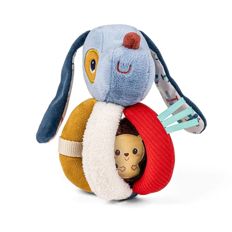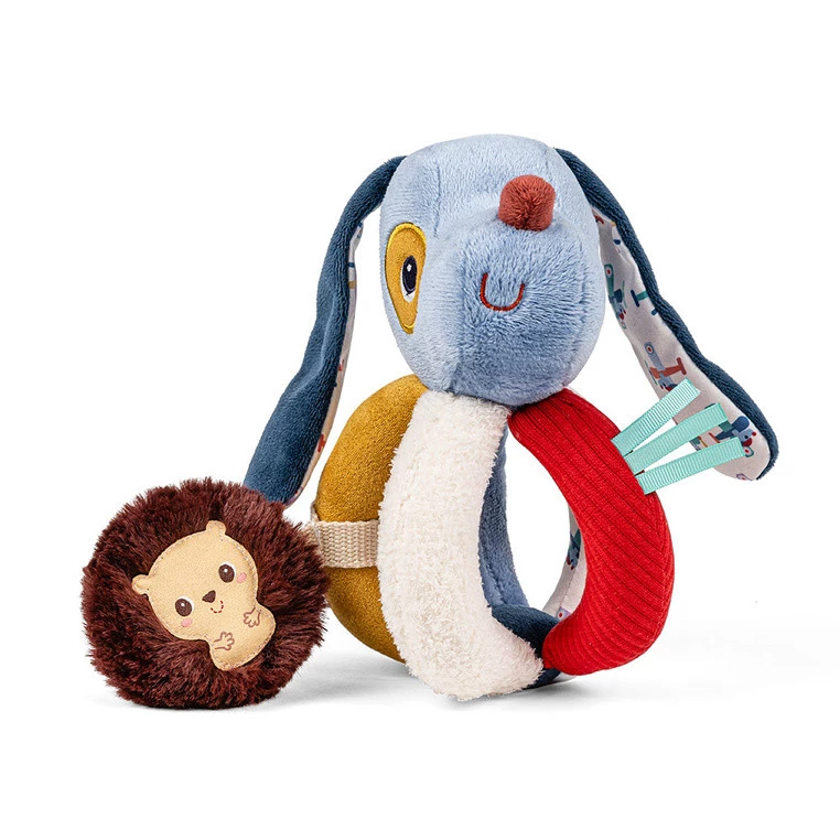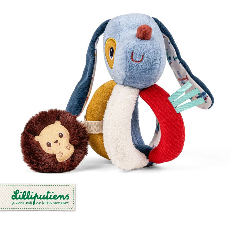 Grzechotka z uchwytami z kolekcji Piesek Jules belgijskiej marki Lilliputiens to aktywizująca zabawka dla niemowląt. Ma postać pluszowego pieska z długimi uszami i ciałem-piłką, złożoną z pięciu poręcznych uchwytów, wykonanych z różnorodnych tkanin. Dodatkowo jeden z nich szeleści przy pocieraniu, na innym znajdują się stymulujące wypustki, a na kolejnym zamocowana jest jeszcze jedna grzechotka – puchaty Jeżyk Leon, którego można przekładać między uchwytami. Zabawka rozwija małą motorykę (chwytanie, potrząsanie, przekładanie), aktywizuje zmysł słuchu (grzechocze, szeleści), wzroku i dotyku.