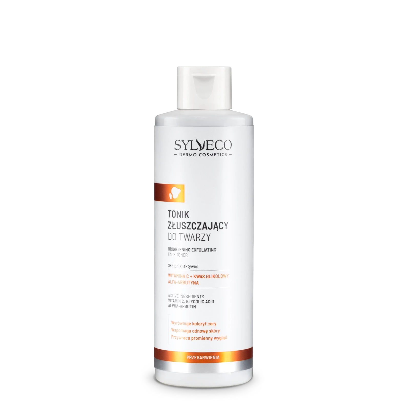 Złuszczający tonik do twarzy powstał z myślą o osobach zmagających się z przebarwieniami posłonecznymi, pozapalnymi, potrądzikowymi, zmianami barwnikowymi i nierównym kolorytem skóry. Zawarte w produkcie kwas kojowy i alfa-arbutyna redukują widoczność przebarwień i plam pigmentacyjnych. Kwas glikolowy dzięki właściwościom złuszczającym odnawia wierzchnie warstwy skóry, zmniejszając przebarwienia. Kwas azelainowy i azeloglicyna zapewniają odpowiednie nawilżenie, a przy tym redukują zaczerwienienia. Znane ze swoich właściwości kojących alantoina, niacynamid i panthenol łagodzą podrażnienia i przyspieszają regenerację. Witamina C, dzięki właściwościom antyoksydacyjnym, zmniejsza negatywne skutki stresu oksydacyjnego. Produkt posiada delikatny zapach, kompozycja zapachowa jest wolna od alergenów, dzięki czemu tonik mogą stosować również osoby z wrażliwą cerą.Aqua, Propylene Glycol, Lactic Acid, Polysorbate 20, Glycerin, Potassium Azeloyl Diglycinate, Panthenol, Glycolic Acid, Kojic Acid, Alpha-Arbutin, Betaine, Niacinamide, Azelaic Acid, Allantoin, Magnesium Ascorbyl Phosphate, Phytic Acid, Benzyl Alcohol, Dehydroacetic Acid, Parfum.