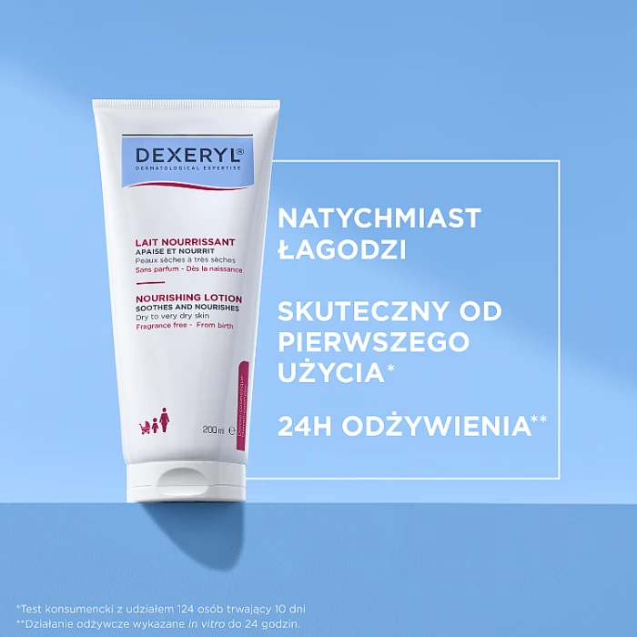 DEXERYL Mleczko odżywcze zostało opracowane z myślą o pielęgnacji odwodnionej, wrażliwej skóry suchej i bardzo suchej, Zapewnia natychmiastową skuteczność potwierdzoną przez 95% użytkowników, którzy stwierdzili zmniejszenie uczucia ściągnięcia skóry już po pierwszym użyciu. To mleczko intensywnie nawilża i odżywia skórę przez 24 godziny, wspierając funkcje naskórka przez zachowanie nawilżenia i syntezę lipidów. Dzięki zawartości kwasu glicyretynowego natychmiast koi skórę. Jego lekka formuła szybko się wchłania, umożliwiając szybkie ubieranie się, jednocześnie zapewniając skórze elastyczność i uczucie komfortu Idealnie nadaje się do stosowania na ciało, w tym twarz i dłonie To mleczko, jest odpowiednie do codziennego stosowania przez cały rok lub w przypadku okazjonalnej lub sezonowej suchości skóry Może być stosowane pod makijaż. Butelka z pompką o pojemności 500 ml umożliwia łatwe i praktyczne stosowanie przez całą rodzinę, w tym dzieci To mleczko zostało przebadane pod kontrolą dermatologiczną Odpowiada na potrzeby skóry wrażliwej, jest bezzapachowe, hipoalergiczne i ma niekomedogenną formułę, Zapewnia przyjemną i skuteczną pielęgnację. Wybierz DEXERYL Mleczko odżywcze aby uzyskać intensywne nawilżenie, długotrwałe odżywienie i cieszyć się lekką konsystencją mleczka Aby zapewnić kompleksową pielęgnację suchej lub odwodnionej skórze, używaj również kremu myjącego pod prysznic DEXERYL. Nakładać cienką warstwę 1-2 razy dziennie na czystą, suchą skórę. Nasza rada: warto stosować po myciu na delikatnie wilgotną skórę, aby uzyskać uczucie miękkości. Nie stosować w okolicach oczu W razie kontaktu z oczami natychmiast przemyć obficie wodą.
