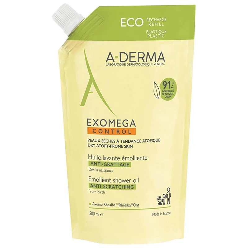 - A-Derma Exomega Control Olejek emolient pod prysznic EKO uzupełnienie to produkt do kąpieli przeznaczony do skóry podrażnionej, suchej, ze skłonnością do atopii.