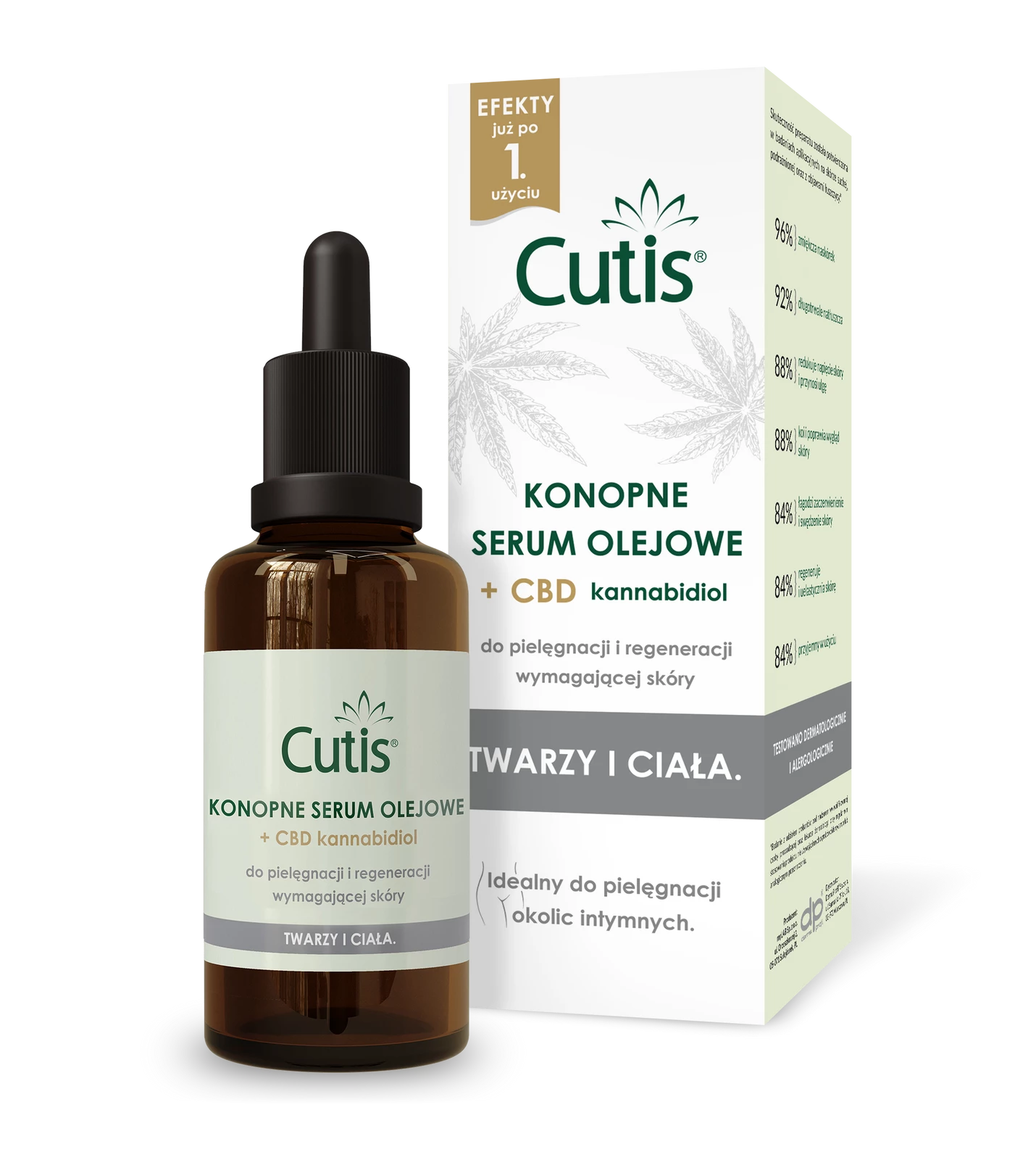 CUTIS konopne serum olejowe + CBD kannabidiol to preparat na bazie oleju konopnego + CBD kannabidiolu przeznaczony do codziennej pielęgnacji wymagającej skóry twarzy i całego ciała. Bogata formuła preparatu oparta jest na synergicznym działaniu Oleju Konopnego, CBD Kannabidiolu, olejku z czarnuszki, wyciągu z nasion ostropestu, żywicy z kadzidłowca, skwalanu i steroli sojowych, o silnych właściwościach regenerujących i odbudowujących. Olejek długotrwale nawilża i natłuszcza skórę, łagodzi swędzenie i zaczerwienie skóry, wpływa na prawidłowy proces złuszczania się naskórka. Zawarte w serum oleje przyspieszają proces odnowy, co redukuje napięcie skóry, przynosi ulgę i poprawia jej ogólną kondycję.