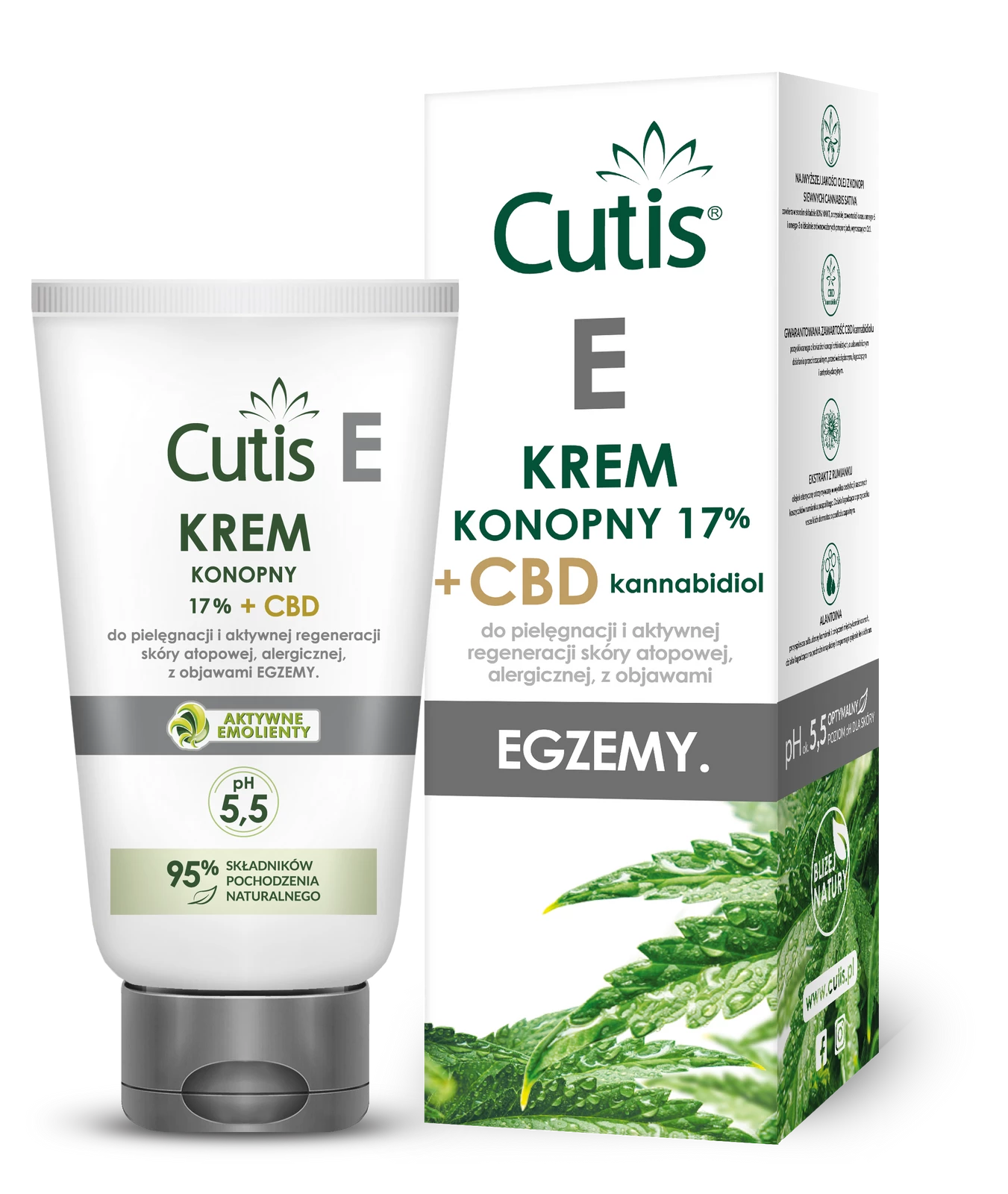 CUTIS E - EGZEMA krem konopny 17% + CBD to aktywny emolient na bazie oleju konopnego o lepszej formule, wzbogaconej gwarantowaną zawartością CBD - kannabidiolu, substancji aktywnej o silnych właściwościach przeciwzapalnych, przeciwbólowych, przeciwalergicznych i antybakteryjnych. Bogata formuła preparatu, oparta na wyselekcjonowanych i skutecznych substancjach, działa zarówno na powierzchni skóry, jak i w jej głębokich warstwach, dzięki czemu redukuje objawy wielu dermatoz, takich jak m.in.: egzema, atopowe zapalenie skóry (AZS) czy alergie.