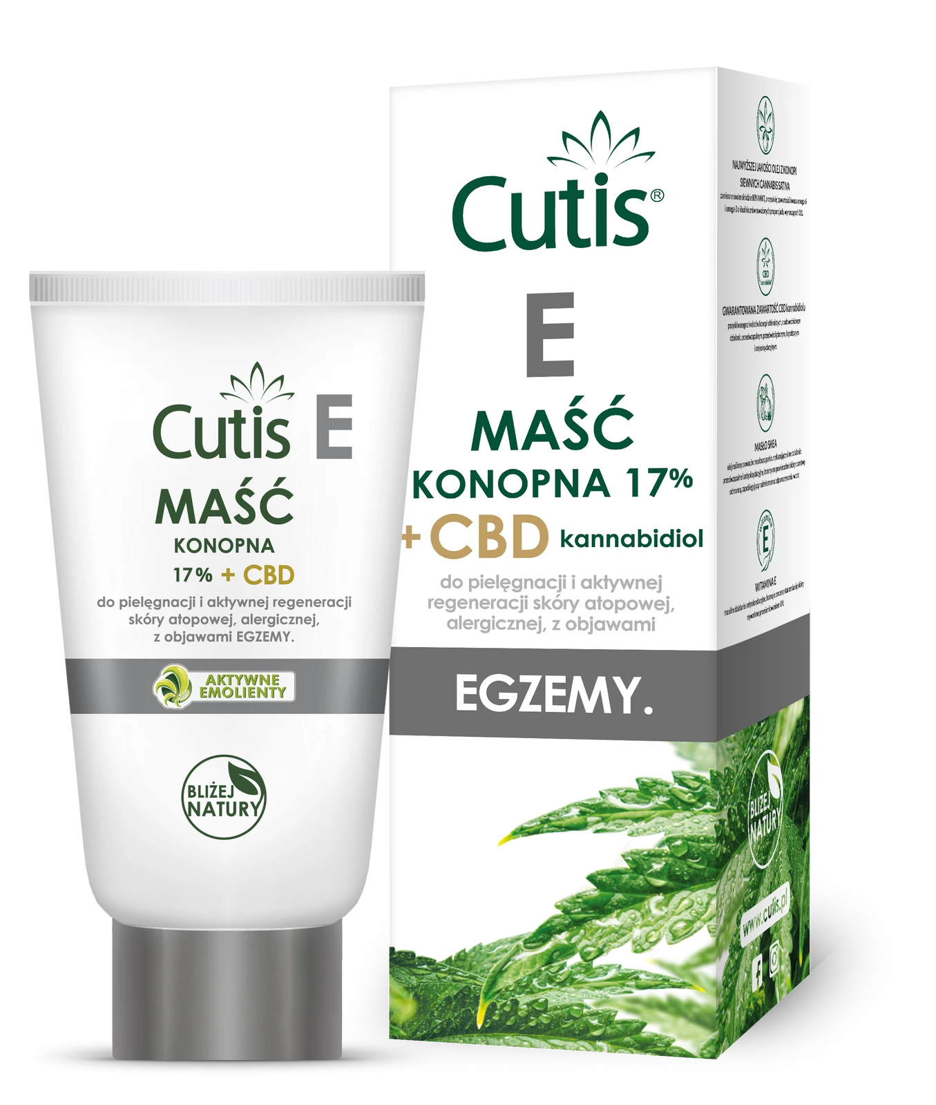 CUTIS E - EGZEMA maść konopna 17% + CBD to aktywny emolient na bazie oleju konopnego o lepszej formule, wzbogaconej gwarantowaną zawartością CBD - kannabidiolu, substancji aktywnej o silnych właściwościach przeciwzapalnych, przeciwbólowych, przeciwalergicznych i antybakteryjnych. Bogata formuła preparatu, oparta na wyselekcjonowanych i skutecznych substancjach, działa zarówno na powierzchni skóry, jak i w jej głębokich warstwach, dzięki czemu redukuje objawy wielu dermatoz, takich jak m.in.: egzema, atopowe zapalenie skóry (AZS) czy alergie. Idealna do stosowania na noc i w przypadku silnego zaostrzenia zmian skórnych.