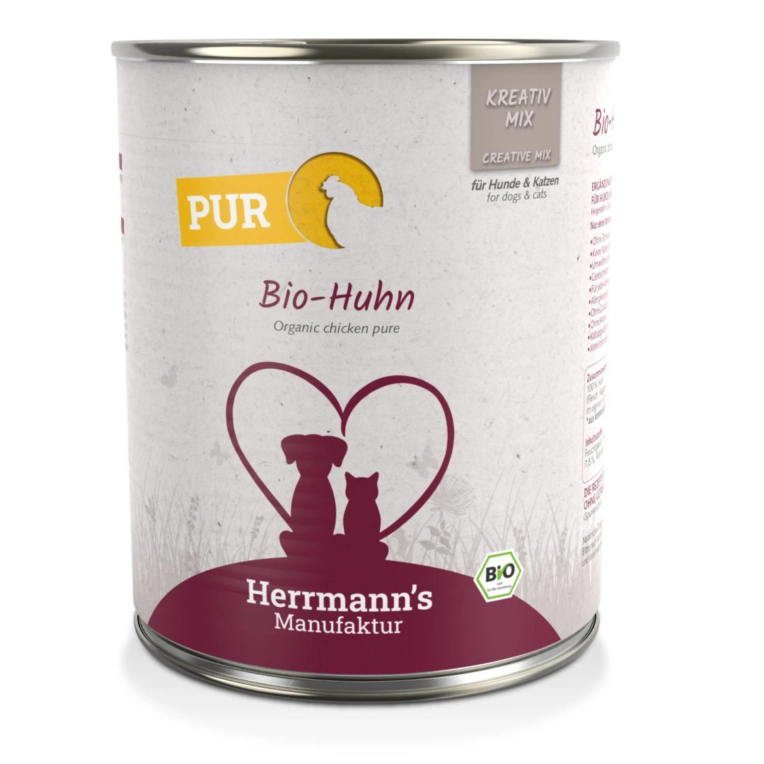 HERRMANN'S MANUFAKTUR Kreativ Mix BIO HUHN PUR to 100% najczystszego mięsa mięśniowego, wartościowych serc kurczaka oraz tuszek i szyjek stanowiących także źródło wapnia. Rozpieszczaj swojego pupila najwyższej jakości karmą z mięsa pochodzącego z ekologicznego kurczaka czyli zawierającego więcej wartościowych składników odżywczych, zdrowszego i smaczniejszego.