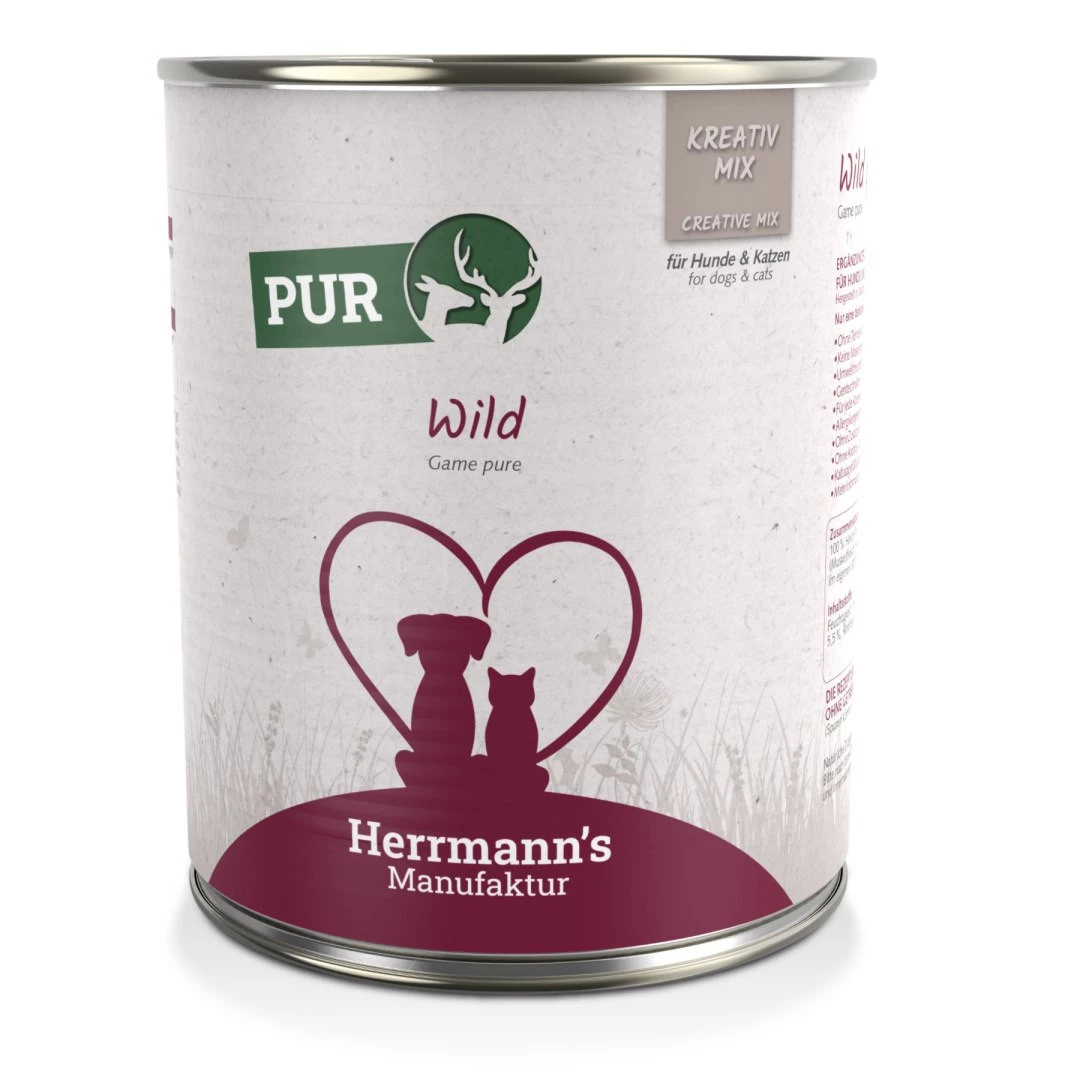 HERRMANN'S MANUFAKTUR Kreativ Mix WILD PUR to 100% najczystszego mięsa mięśniowego, wartościowych serc i płuc dziczczyny. Rozpieszczaj swojego pupila najwyższej jakości karmą z mięsa pochodzącego z dziczyzny - jelenia i sarny. Zwierzęta dorastały na wolności i odżywiały się naturalną dietą. Ich mięso jest zdrowsze - wolne od chemicznych, alergizujących zanieczyszczeń, zawiera więcej wartościowych składników odżywczych.