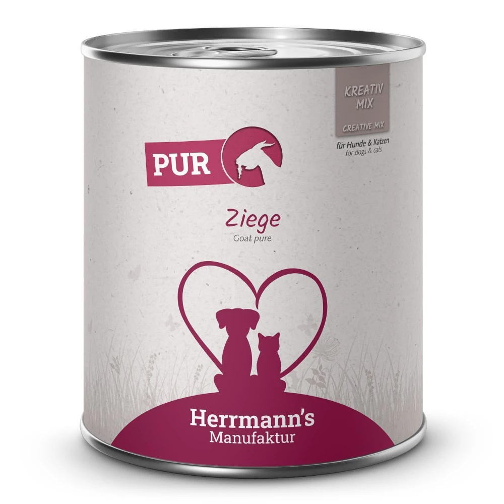 Herrmann's Manufaktur Kreativ Mix ZIEGE PUR to 100% najczystszego mięsa mięśniowego i wartościowych podrobów kozy. Rozpieszczaj swojego pupila najwyższej jakości karmą z mięsa pochodzącego z kóz hodowanych na pastwiskach czyli mięsa zawierającego więcej wartościowych składników odżywczych, zdrowszego i smaczniejszego.