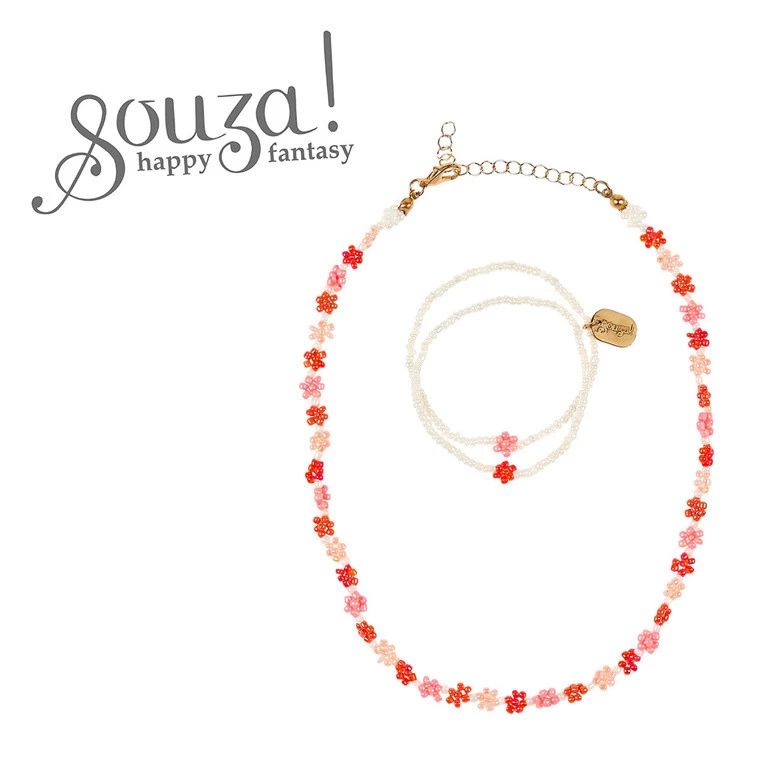 Naszyjnik i dwie bransoletki Millie holenderskiej marki Souza! to zestaw biżuterii, który tworzą: naszyjnik z różowych i czerwonych koralikowych kwiatków oraz dwie białe bransoletki – jedna z różowym, a druga z czerwonym kwiatkiem. Bransoletki mają 14 cm obwodu każda, a naszyjnik – 34 cm. Bransoletki są elastyczne i wygodne do nakładania. Biżuteria jest nietoksyczna i nie podrażnia skóry. Idealna zarówno na przyjęcia, jak i do noszenia na co dzień. Sprawdzi się także jako stylowy prezent.