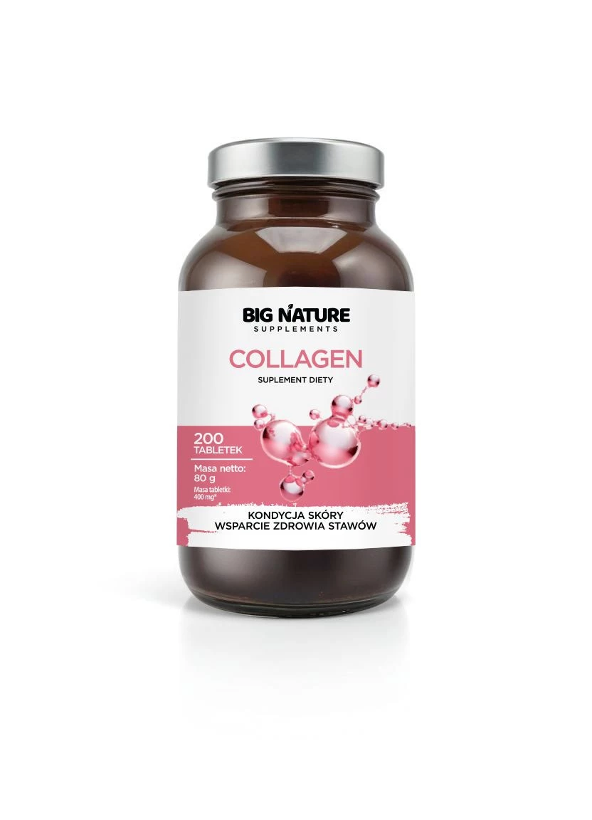 - BIG NATURE COLLAGEN to suplement diety zawierający czysty kolagen wołowy typu I – kluczowy składnik wspierający elastyczność skóry oraz kondycję kości i stawów.