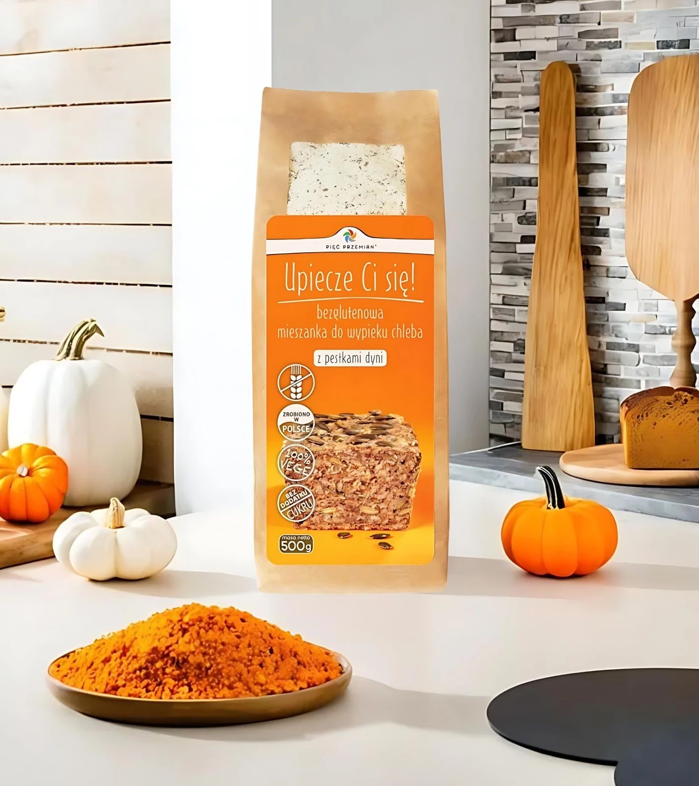 - Smaczna i pożywna mieszanka do samodzielnego wypieku chleba, idealna dla osób na diecie bezglutenowej. Zawiera pestki dyni i szereg naturalnych składników, które nadają wypiekowi wyjątkowy smak i wartości odżywcze.