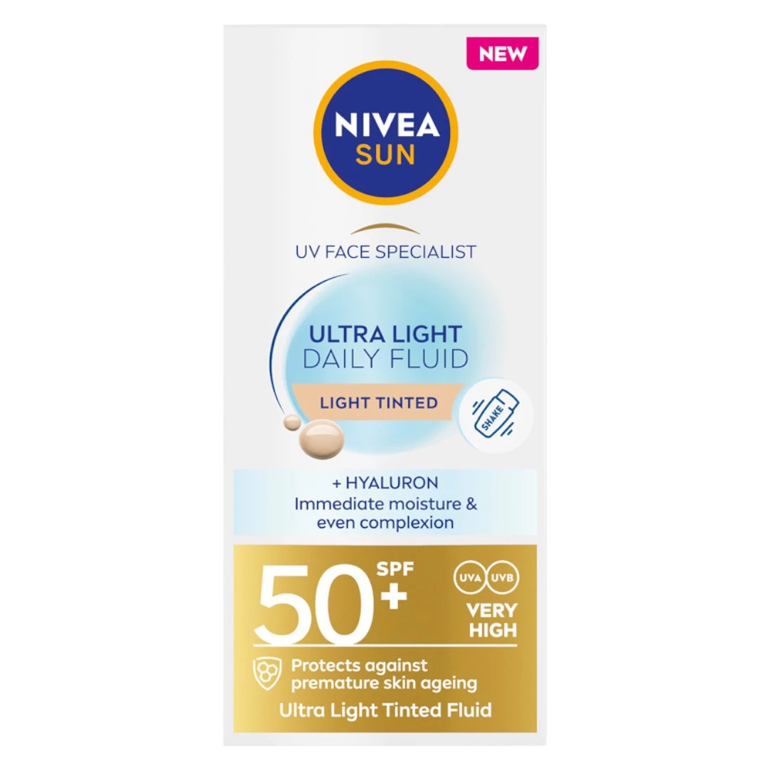 NIVEA Ultra Light Daily Fluid Light Tinted z bardzo wysoką ochroną SPF50+ został specjalnie opracowany, aby chronić i wygładzać skórę twarzy w kilka sekund. Innowacyjna, lekka formuła chroni zdrową skórę przed promieniami UVA/UVB oraz przed Wysokoenergetycznym Światłem Widzialnym (HEVL) powodującym przedwczesne starzenie się skóry. Innowacyjna, ultra-lekka formuła chroni zdrową skórę przed promieniami UVA/UVB oraz przed Wysokoenergetycznym Światłem Widzialnym (HEVL) powodującym przedwczesne starzenie się skóry. Wzbogacona w kwas hialuronowy natychmiastowo nawilża i zapewnia uczucie świeżej cery. Dodatkowo zawarty w niej Licochalcone A, skuteczny antyoksydant, aktywuje własne mechanizmy obronne skóry i tym samym chroni komórki przed stresem oksydacyjnym.