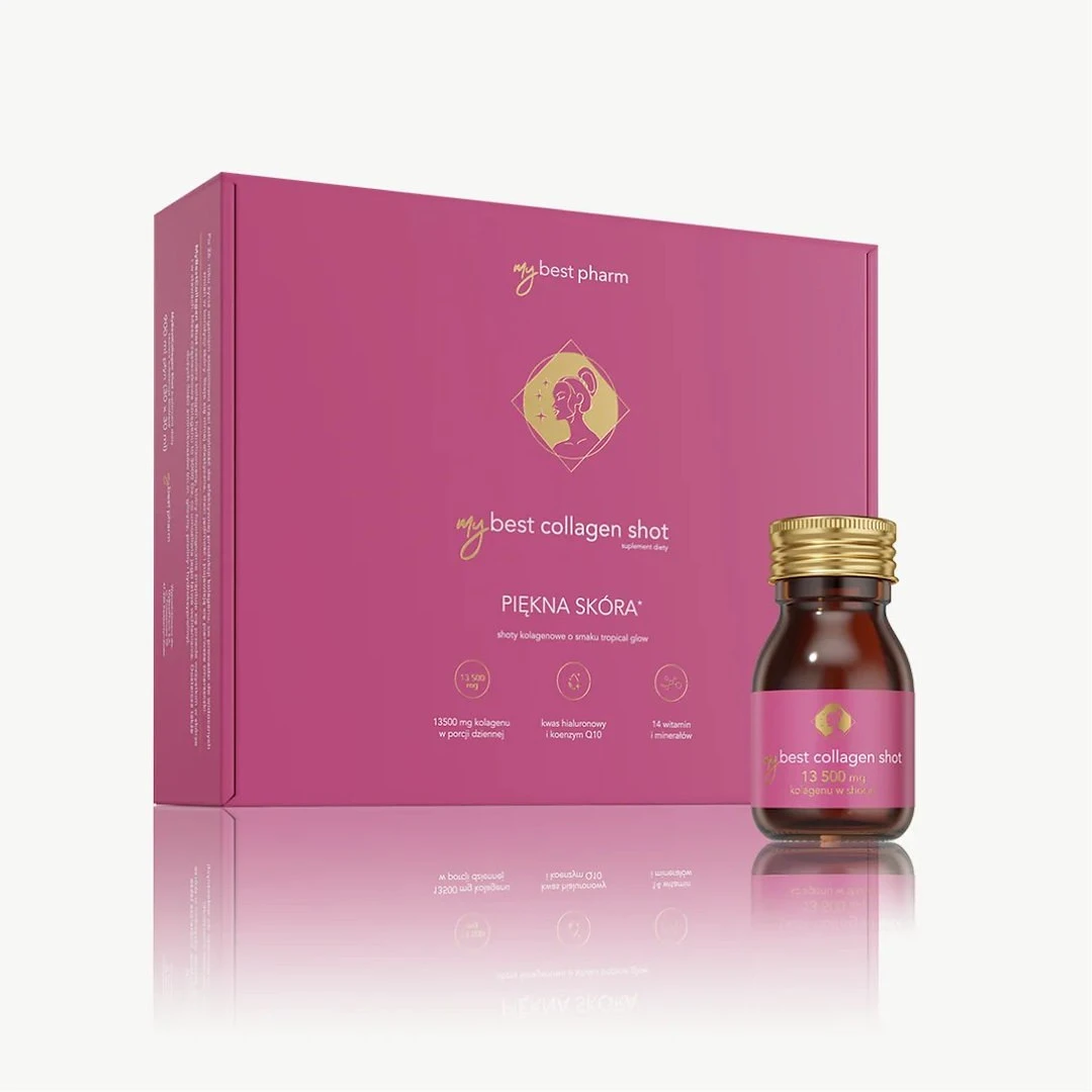 Produkt MyBestCollagen Kolagen w płynie Shot 13 500 mg x 30 szt. mybestpharm to suplement diety. Nie może być stosowany jako substytut zróżnicowanej diety. Pamiętaj o zrównoważonym sposobie żywienia i zdrowym trybie życia.- Przechowuj w chłodnym miejscu, z dala od bezpośredniego światła słonecznego.