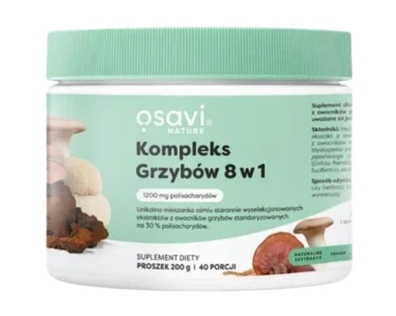 - OSAVI Kompleks Grzybów 8 w 1 to suplement diety w formie proszku, zawierający ekstrakty wyłącznie z owocników grzybów, standaryzowane na 30% polisacharydów.