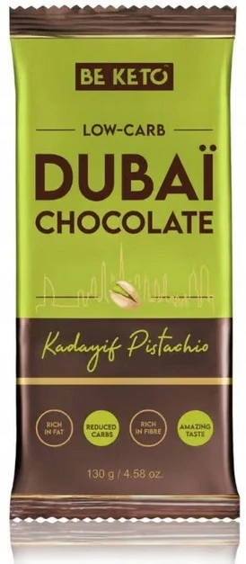 - BeKeto® Keto Dubaï Chocolate 130 g to wyjątkowa czekolada bez dodatku cukru, stworzona dla fanów diety keto, low-carb oraz wszystkich, którzy cenią sobie jakość, smak i sycące składniki.