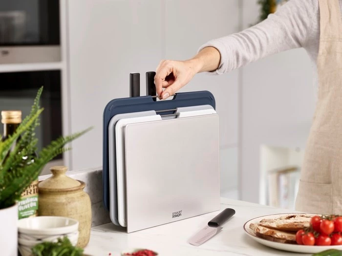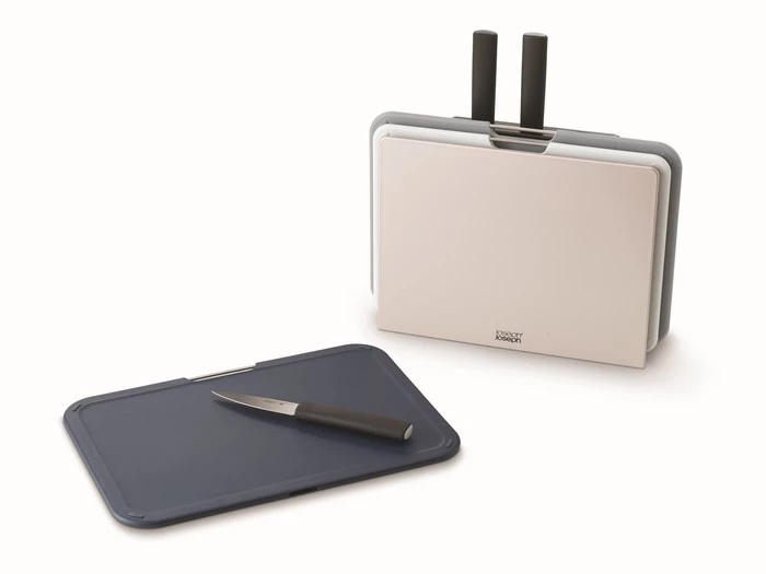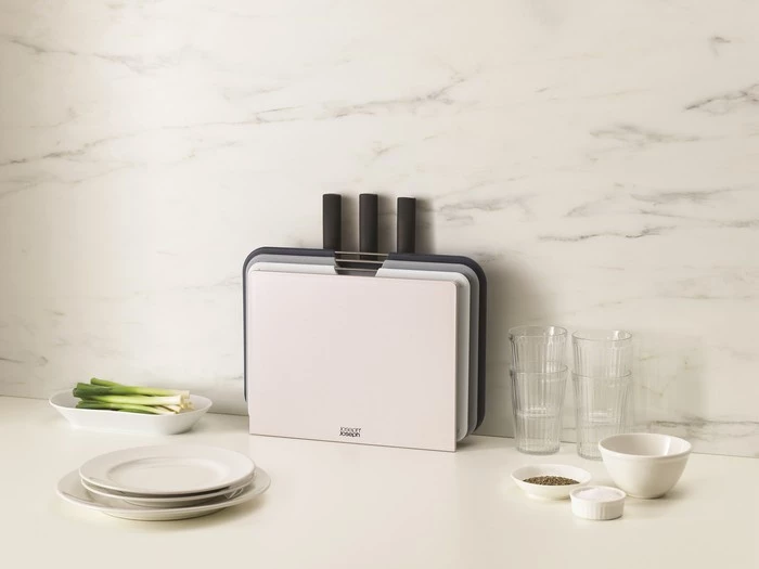 - deski wykonane z tworzywa sztucznego (każda w innym kolorze) z uchwytami ze stali nierdzewnej, posiadają teksturowaną powierzchnię – przyjazną ostrzom noży i elementy antypoślizgowe,