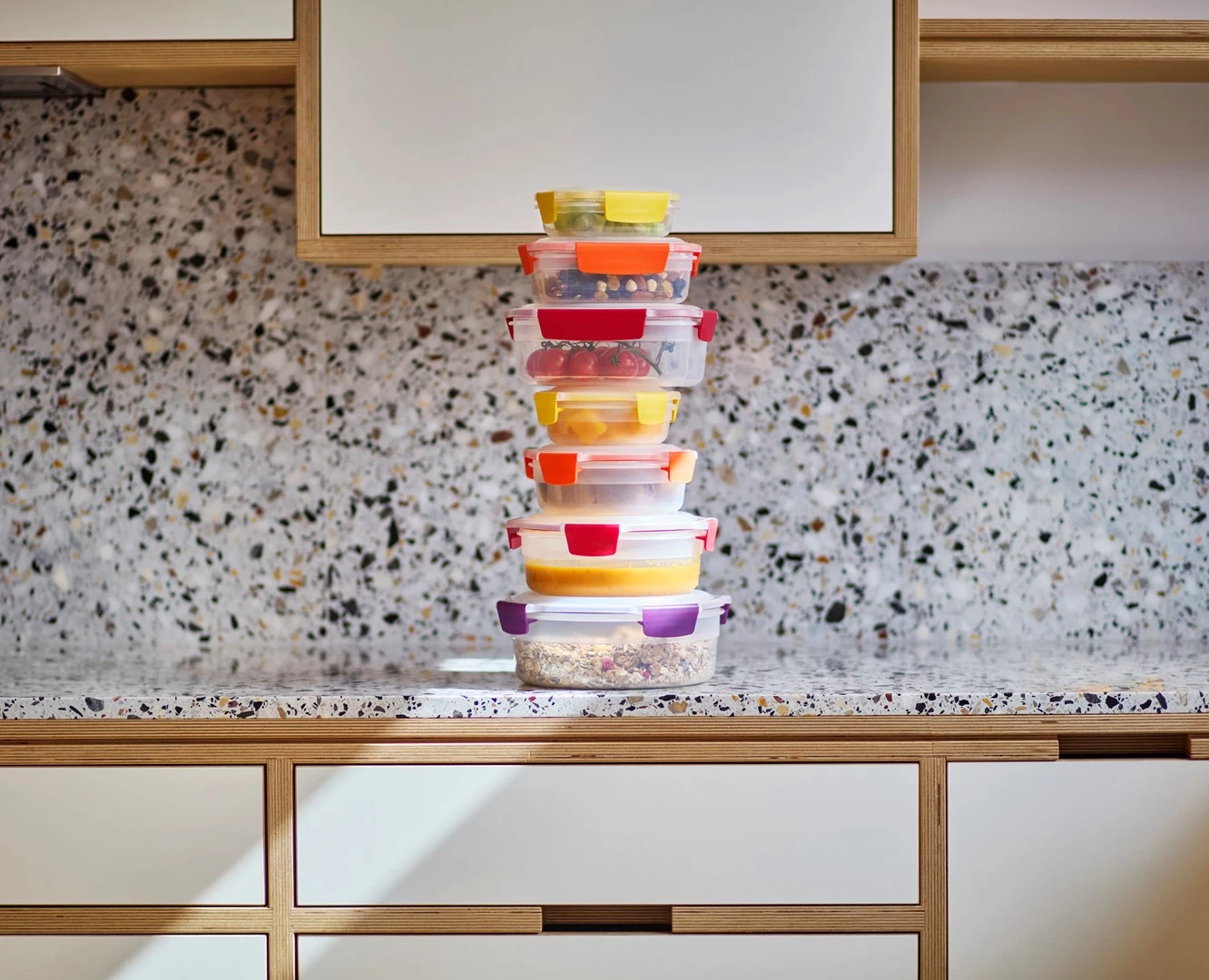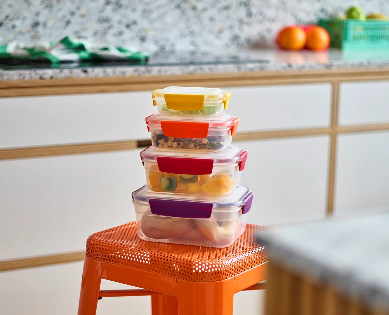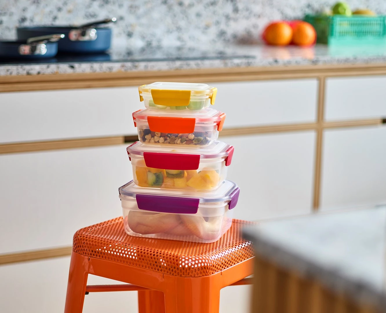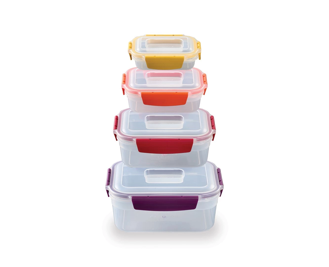 - w komplecie pojemniki okrągłe (1,6 l / 1 l / 0,67 l / 0,38 l) oraz prostokątne (1,85 l / 1,1 l / 0,54 l / 0,23 l),