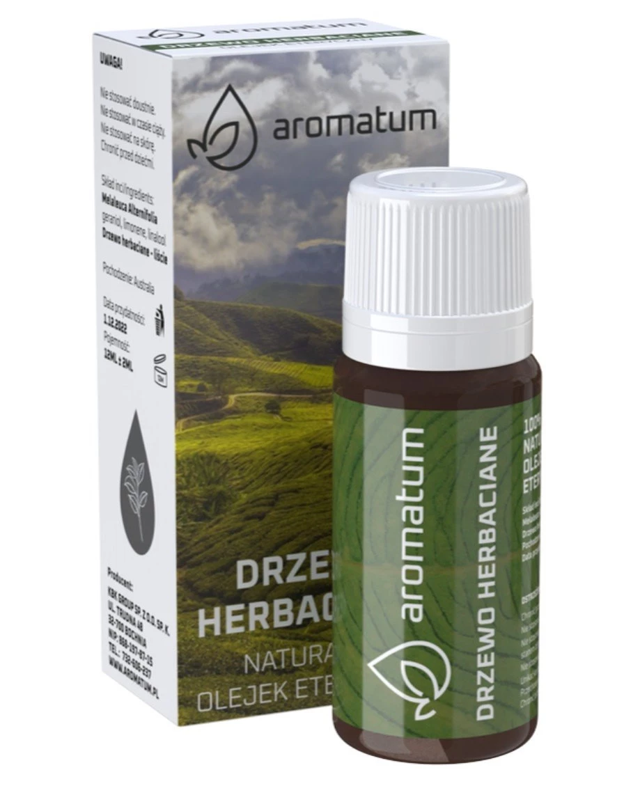 Aromatum Naturalny olejek eteryczny drzewo herbaciane 12 ml to produkt pozyskiwany z liści drzewa herbacianego. Charakteryzuje się on intensywnym, świeżym zapachem i doskonale komponuje się z innymi naturalnymi olejkami – szczególnie cytrusowymi i ziołowymi.