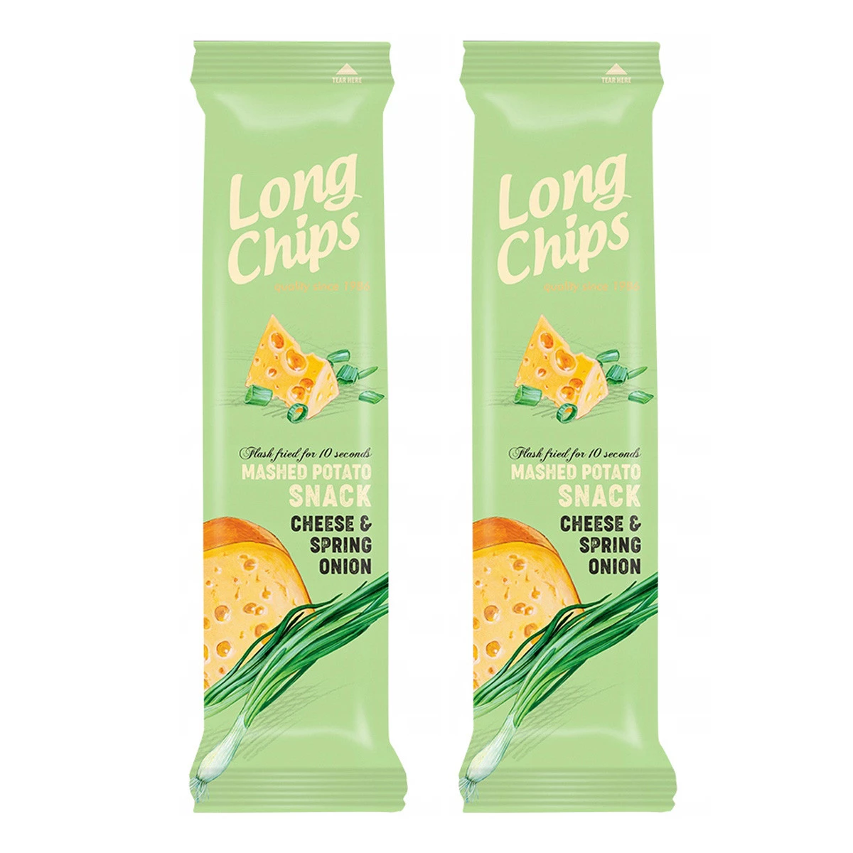 - Long Chips Cheese & Spring Onion o smaku sera i cebulki to wyjątkowe przekąski ziemniaczane. Smażone w wysokiej jakości oleju rzepakowym tylko przez 10 sekund, przez co są niesamowicie chrupkie i nie są tak tłuste jak klasyczne chipsy.