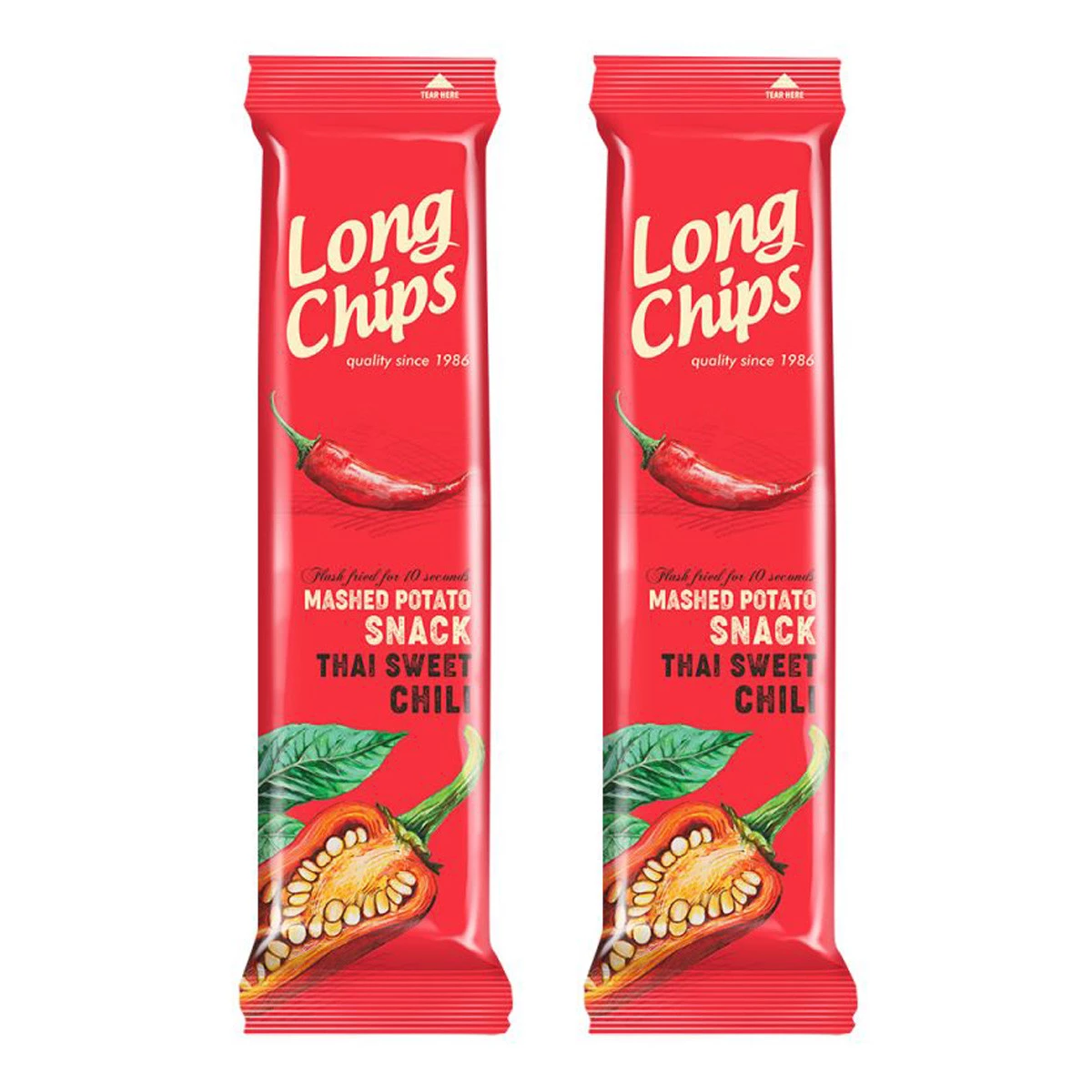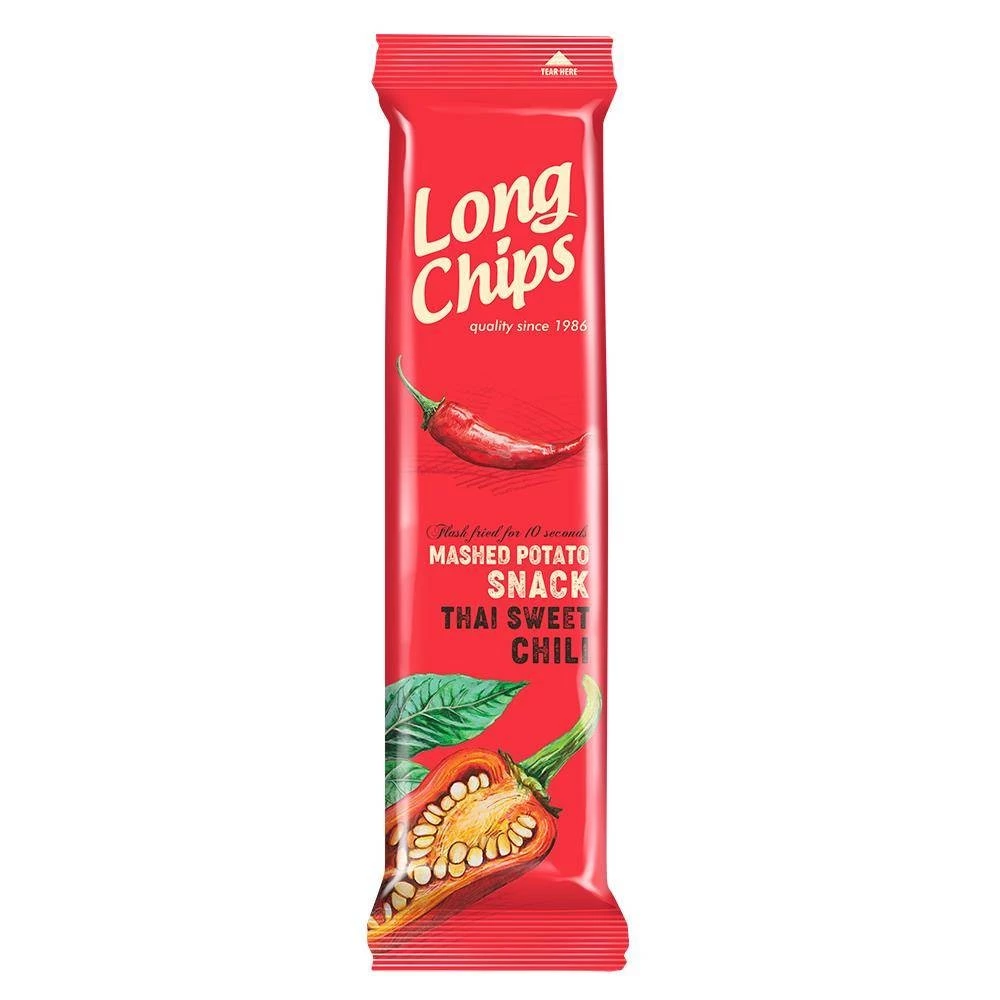 - Long Chips Thai Sweet Chili o smaku słodkiego chilli to wyjątkowe przekąski ziemniaczane. Smażone w wysokiej jakości oleju rzepakowym tylko przez 10 sekund, przez co są niesamowicie chrupkie i nie są tak tłuste jak klasyczne chipsy.