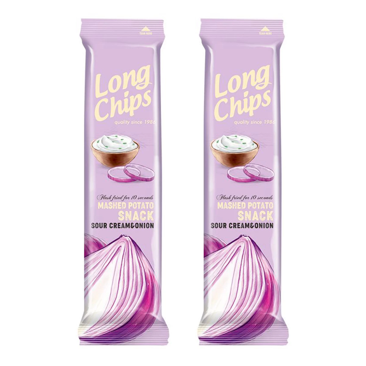 - Long Chips Sour Cream & Onion o smaku śmietany i cebulki to wyjątkowe przekąski ziemniaczane. Smażone w wysokiej jakości oleju rzepakowym tylko przez 10 sekund, przez co są niesamowicie chrupkie i nie są tak tłuste jak klasyczne chipsy.