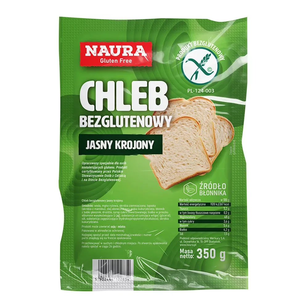 - Chleb bezglutenowy jasny Naura to najlepszy sposób na zdrowe, bezglutenowe kanapki. Receptura opracowana została specjalnie dla osób cierpiących na celiakię i nietolerancję glutenu.