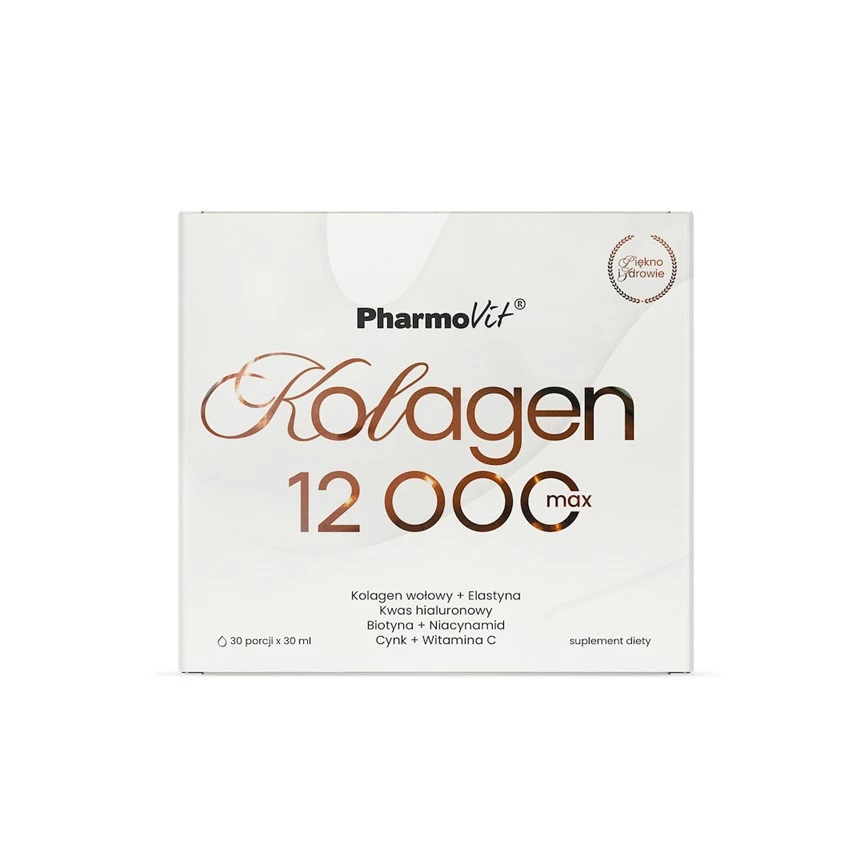 - Kolagen 12000 Max to suplement diety w płynie, który zawiera kolagen wołowy, elastynę w postaci hydrolizatu z ryb morskich, kwas hialuronowy oraz ekstrakty roślinne, witaminy. Kolagen stanowi główny składnik tkanki łącznej.