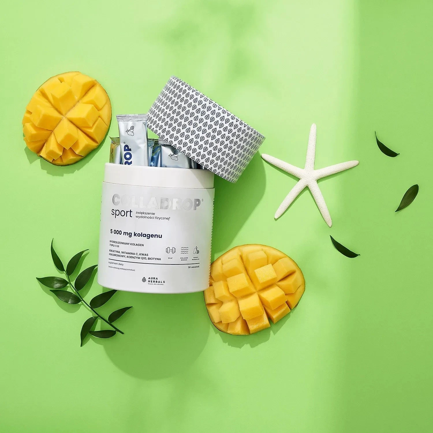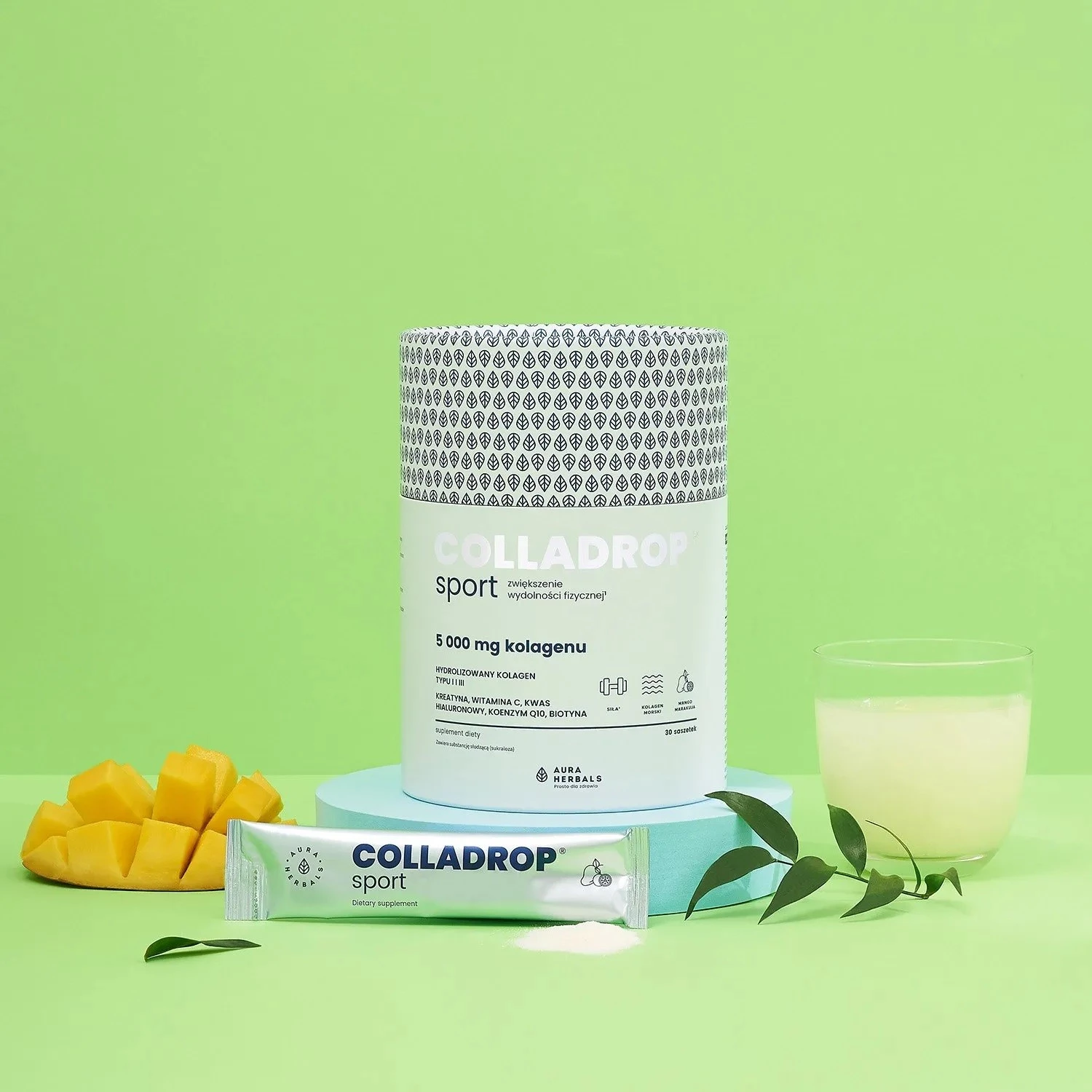 - Colladrop Sport od Aura Herbals to suplement diety w saszetkach, stworzony z myślą o osobach aktywnych fizycznie, które chcą wspierać swój układ ruchu. Każda porcja dostarcza 5000 mg kolagenu morskiego typu I i III.