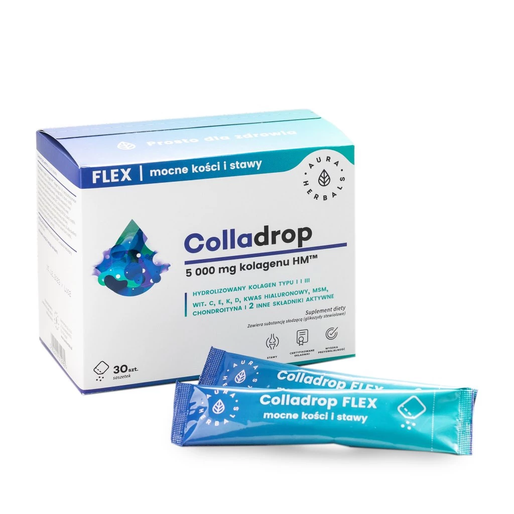 - Aura Herbals Colladrop Flex kolagen morski 5000mg Hydrolizowany kolagen typu I i III 30 dziennych porcji Dlaczego warto wybrać Colladrop Flex, kolagen 5000 mg w saszetkach Aura Herbals