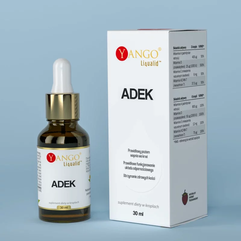 - Kompleks witamin rozpuszczalnych w tłuszczach — A, D, E oraz K2 MK-7 — w formie kropli, idealny dla dzieci od 4. roku życia i dorosłych. Formuła oparta na naturalnych olejach zapewnia wysoką przyswajalność i wygodę stosowania.