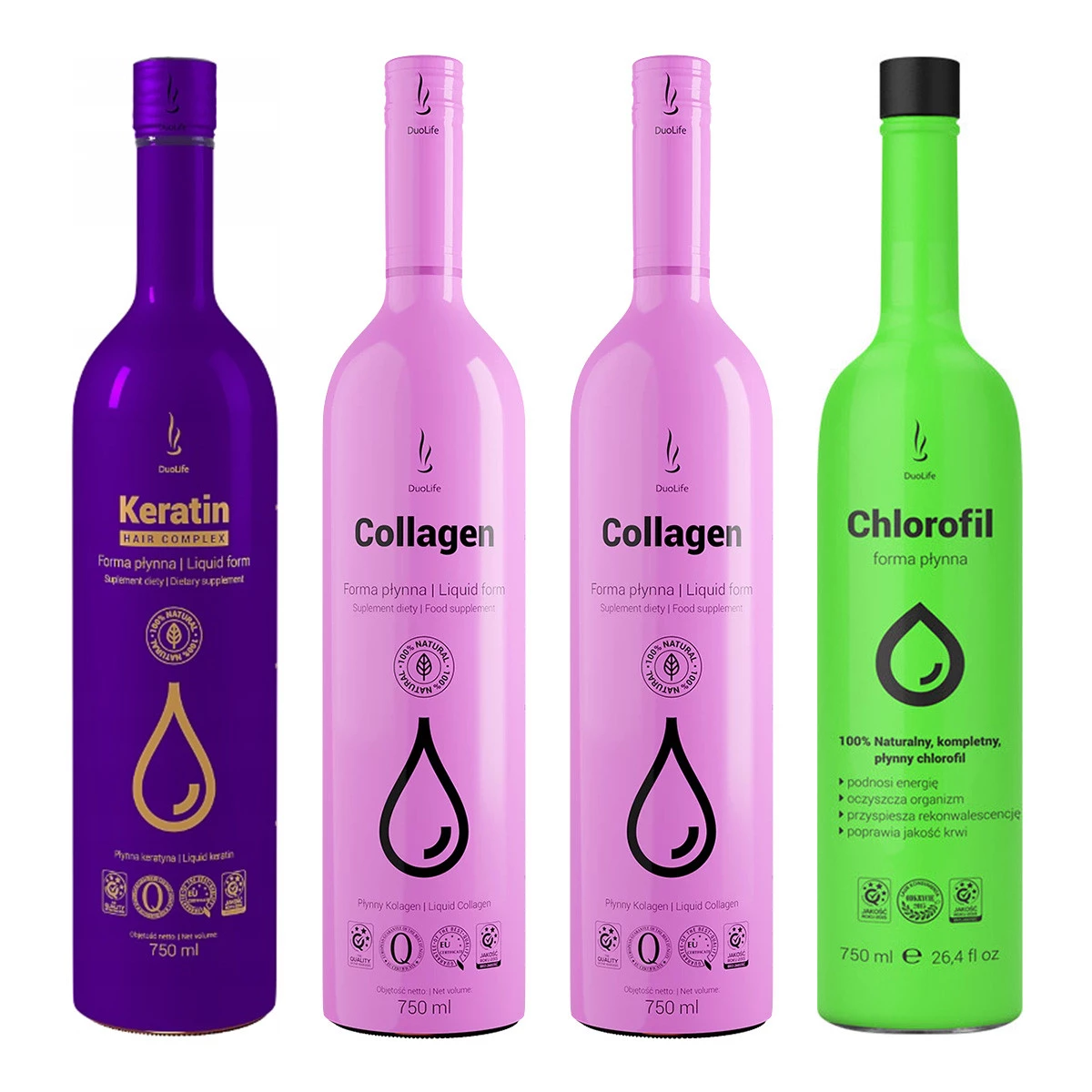 Zestaw mix DuoLife: 2x Kolagen w płynie 750ml, 1x Keratyna w płynie 750ml oraz 1x Chlorofil w płynie 750ml