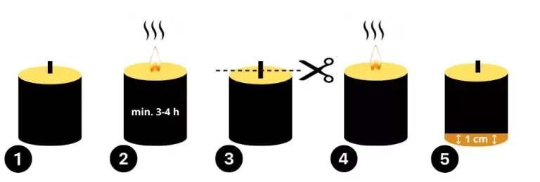 - ✔️ Zastygnięcie: Pozostaw świecę na ok. 6 godzin do stężenia, następnie przytnij knot do 1–1,5 cm.