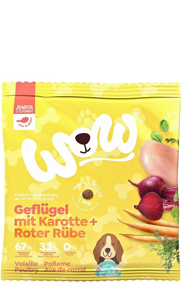 10 x WOW Junior Geflügel - drób i łosoś z marchewką i buraczkami dla szczeniąt (80g)Cena: 4,47 zł / szt.