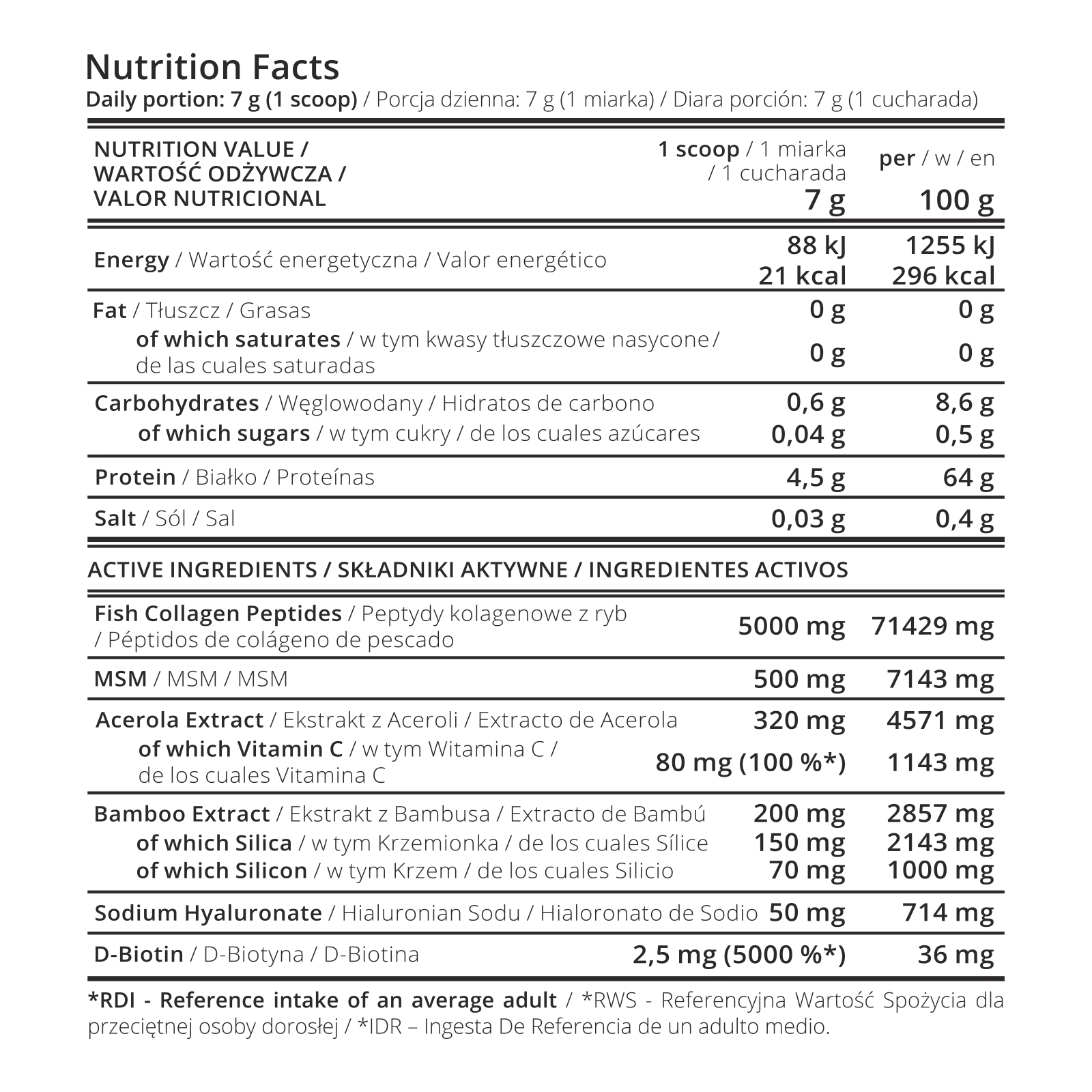 Hydrolizowany kolagen rybi; metylosulfonylometan (MSM); ekstrakt z aceroli (Malpighia glabra) [25% witaminy C]; ekstrakt z bambusa (Bambusa vulgaris) [75% krzemionki]; sok z buraka czerwonego w proszku; kwas hialuronowy (hialuronian sodu); D-biotyna; aromaty naturalne; regulator kwasowości: kwas cytrynowy. Produkt może zawierać ryby.