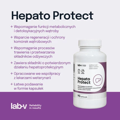 - Lab-v Hepato Protect to specjalistyczny preparat wspierający zdrowie i regenerację wątroby u psów i kotów. Dzięki starannie dobranym składnikom chroni wątrobę przed uszkodzeniami, wspiera jej funkcje metaboliczne i pomaga w detoksykacji organizmu.
