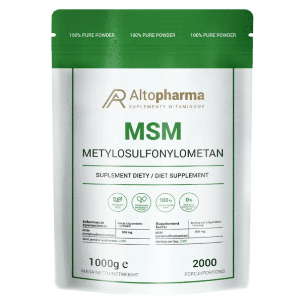 - MSM (metylosulfonylometan) marki Alto Pharma to czysta, organiczna siarka w postaci proszku. Suplement wspiera zdrowie stawów, skóry, włosów i paznokci, a także działa przeciwzapalnie i detoksykująco.
