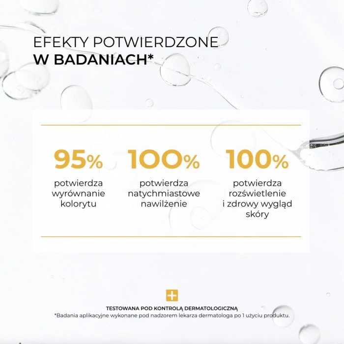 • NIACYNAMID - reguluje proces produkcji melaniny, wyrównując koloryt skóry i wspomagając rozjaśnianie przebarwień.