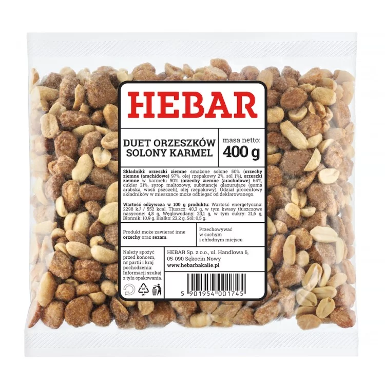 - Duet Orzeszków Solony Karmel Hebar to przekąska, która łączy w sobie wszystko, co najlepsze – delikatne, solone orzeszki ziemne i chrupiące orzeszki w karmelowej polewie.