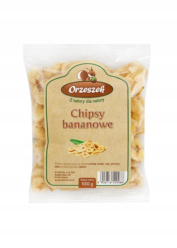 - Chipsy bananowe Orzeszek to chrupiąca i naturalnie słodka przekąska, idealna na każdą porę dnia. Banany są źródłem witaminy C, potasu i błonnika, wspierają koncentrację, poprawiają samopoczucie i dostarczają szybkiej energii.