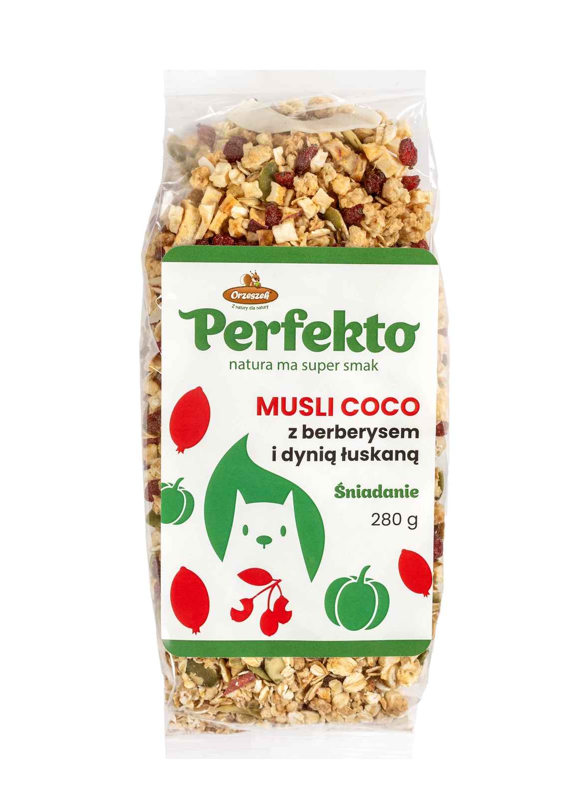 - Aromatyczne musli z dodatkiem kokosa, berberysu i pestek dyni – chrupiąca mieszanka pełna naturalnych składników, idealna na śniadanie lub zdrową przekąskę.