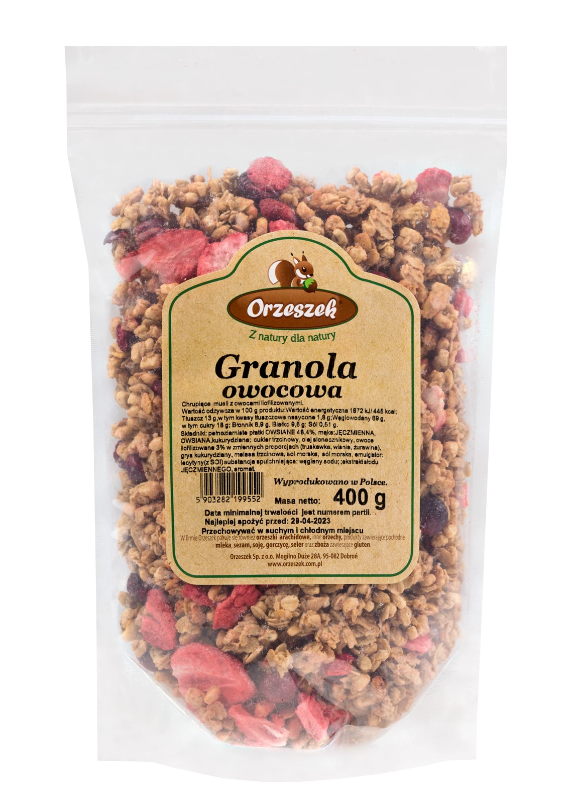 - Chrupiące musli z owocami liofilizowanymi – idealne na śniadanie lub przekąskę w ciągu dnia. Naturalne składniki i owoce nadają mieszance wyjątkowy smak oraz chrupkość.