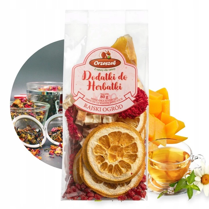 - Odkryj wyjątkowy smak i aromat mieszanki Rajski Ogród! To owocowa kompozycja pełna naturalnych składników, która wzbogaci smak każdej herbaty i nada jej egzotyczny charakter.