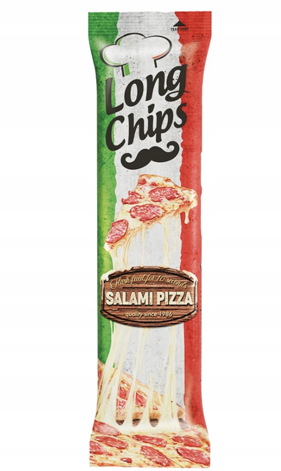 - Wyjątkowe, długie i ultracienkie chipsy ziemniaczane o smaku salami i pizzy.